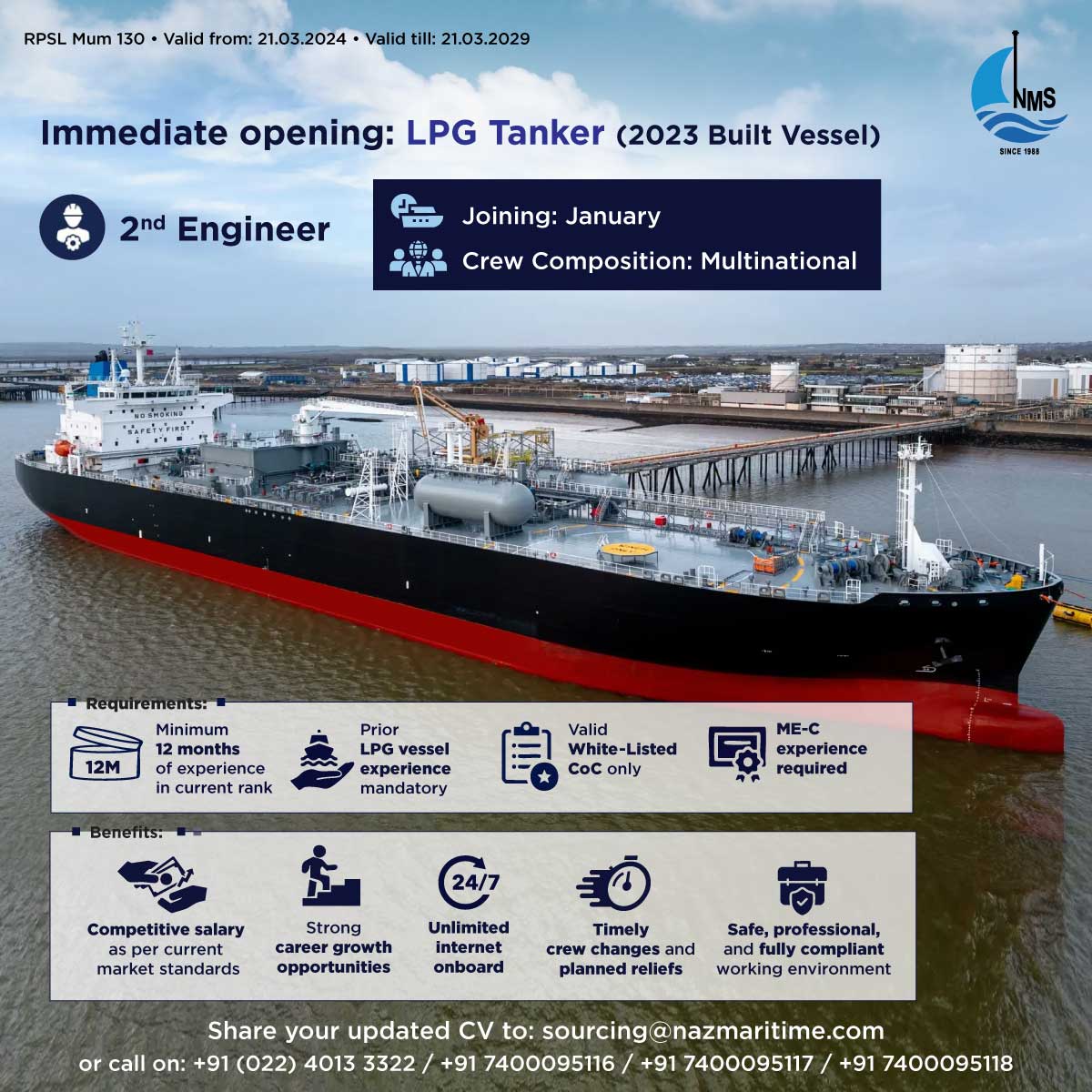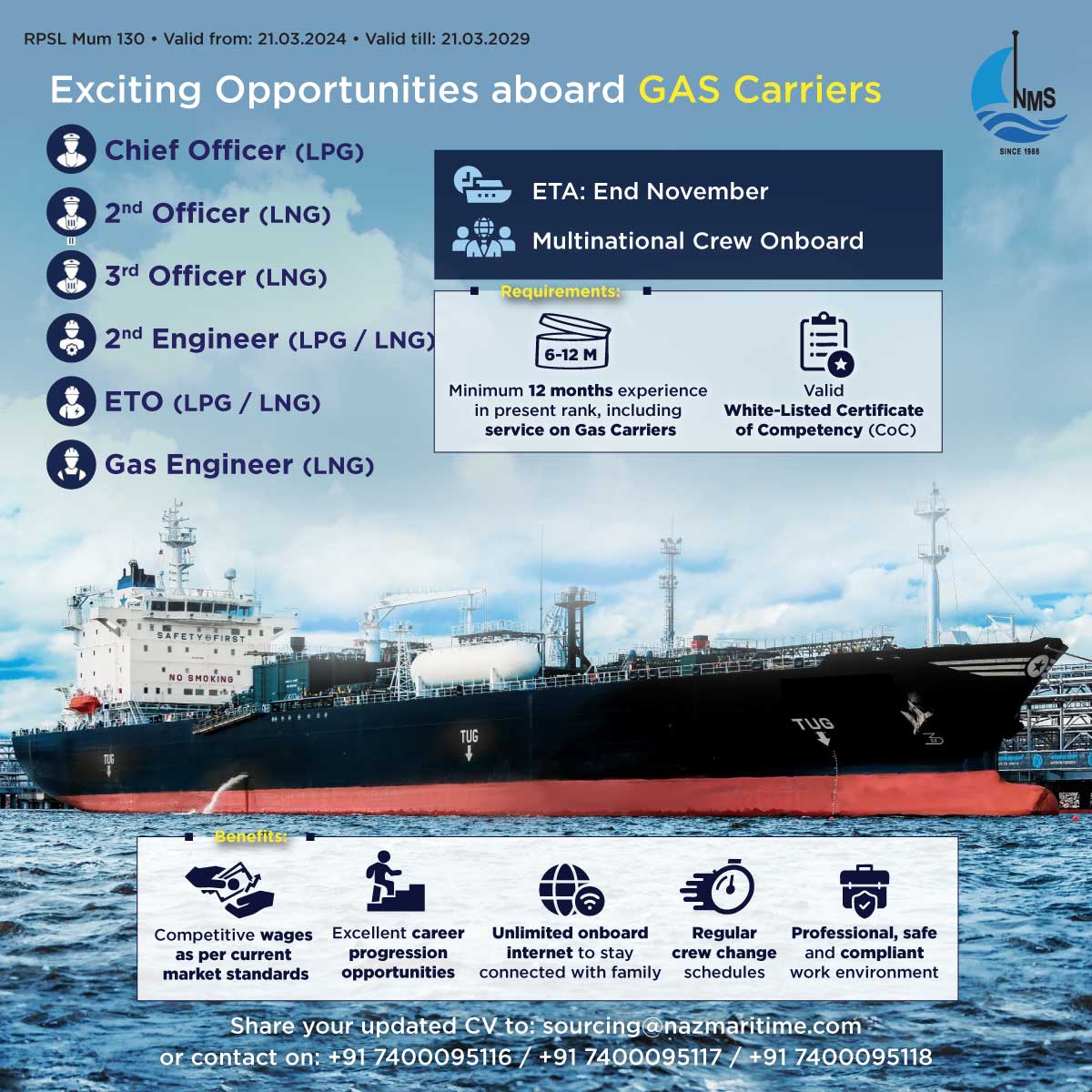 Chief Officer (LPG), 2nd Officer (LNG), 3rd Officer (LNG), 2nd Engineer (LPG/LNG) ETO (LPG/LNG). Gan Engineer (LNG)