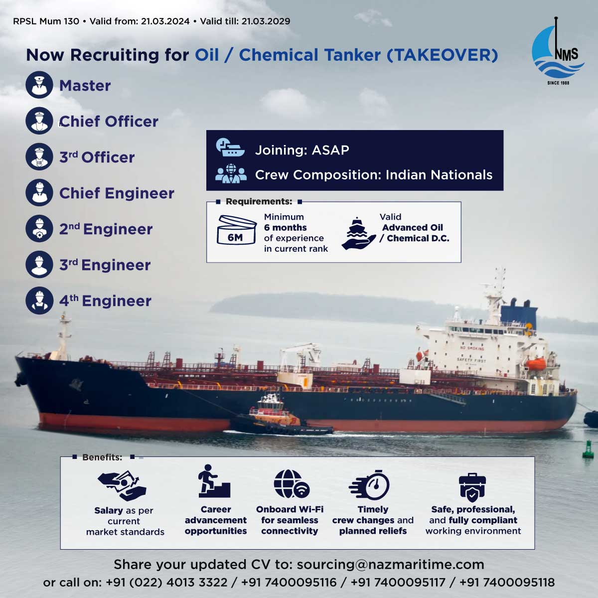 Chief Engineer, Chief Officer, 2nd Officer, 3rd Officer, Electrical Engineer, Pumpman, Fitter