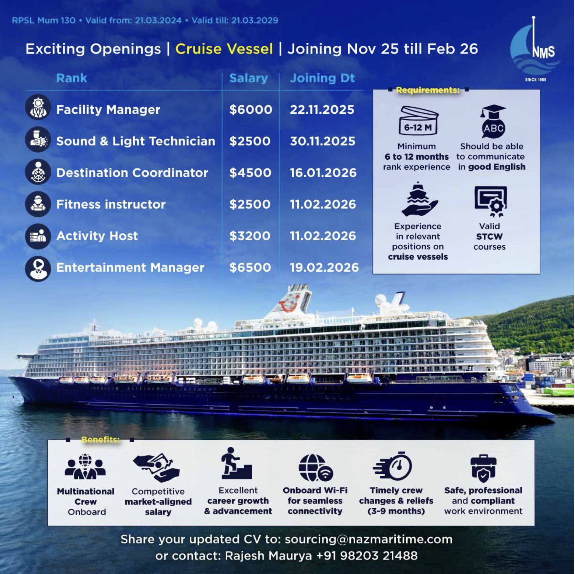 Exciting Openings: Cruise vessel - Joining nov 2025 till feb 2026